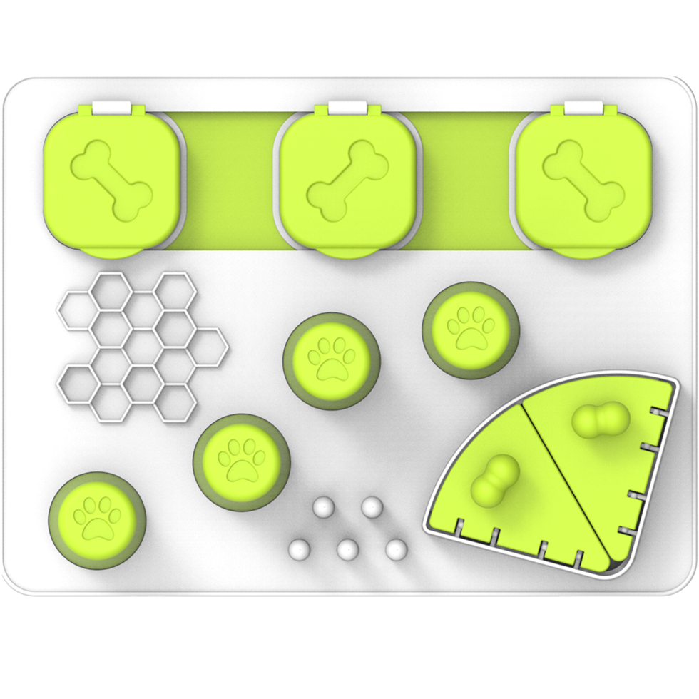Dieses lustige Futterpuzzle lässt Hunde ihre Mahlzeit noch mehr genießen! Der Hund muss die Teile des Puzzles schieben, umdrehen und anheben, um das versteckte Leckerli zu finden. Es regt den Hund geistig an, belohnt ihn und kann gut als Ablenkung dienen, wenn der Hund z. B. allein zu Hause sein muss.