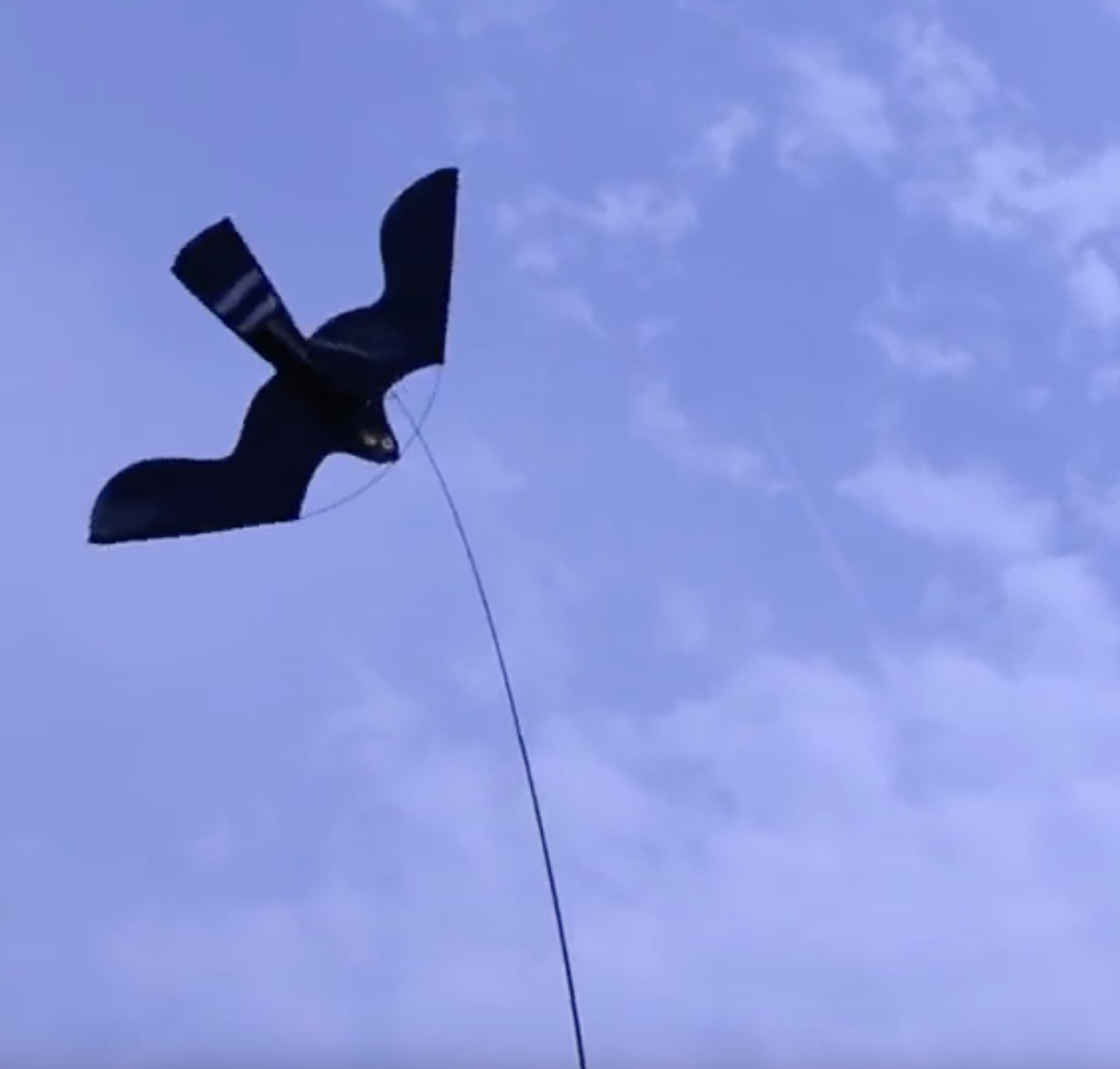 Der Vogel Drache simuliert die Anwesenheit des größten natürlichen Feind der meisten Vögel; den Falken. Verjagt effektiv Tauben, Stare, Gänse und viele andere Vogelarten sowohl innerhalb als auch außerhalb städtischen Gebieten. Schützen Sie mit diesem Drachen Feldfrüchte, Obstplantagen, Dächer und Parkplätze. Wegen des speziellen Designs und der 360-Grad-Drehstangen kann die Leine nicht verknoten!