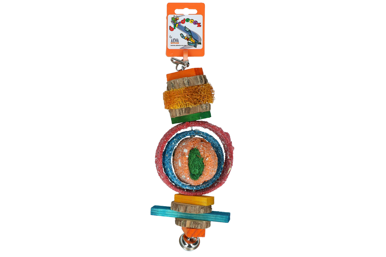 Trägt zur Unterhaltung der Krallen und des Schnabels Ihres Vogels bei. Einfach zu montieren mit Flügelmutterbefestigung. Besteht aus Lufaschwamm, Kreise mit Sandstruktur, farbenfrohes Seil und ein Glöckchen an der Unterseite für extra Spielspaß.