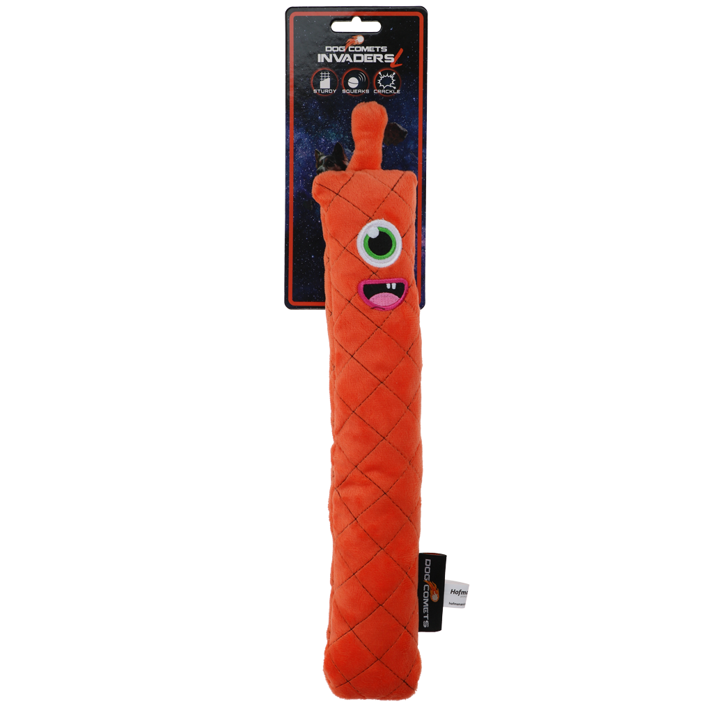 Diese Außerirdischen erobern die Welt zusammen mit den treuesten vierbeinigen Freunden! Diese kuscheligen Wurfstäbchen sind mit einer Schwammfüllung versehen, die sie schwerer und dichter macht als herkömmliches Hundespielzeug. Das knisternde Material im Inneren und der Quietscher sorgen für zusätzliche Stimulation beim Spielen und regen Hunde dazu an, ihre Zähne in das Spielzeug zu versenken. Die Invaders eignen sich perfekt zum Spielen im Haus, zum Kuscheln und für Tauziehen und Apportierspiele. Jeder Invader hat einen einzigartigen Gesichtsausdruck und eine eigene Persönlichkeit.
