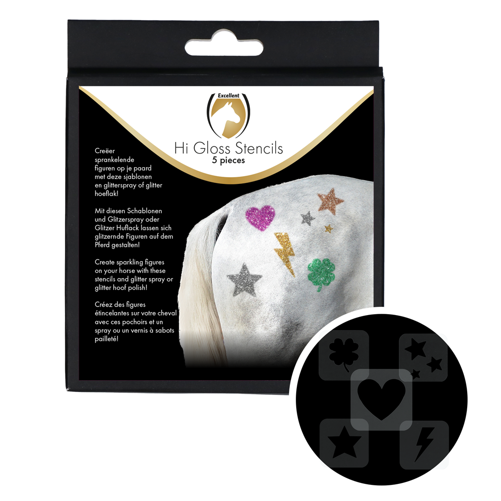 Kreieren Sie glitzernde Figuren auf Ihrem Pferd mit diesen Schablonen und dem Excellent Horse Hi Gloss Glitzerspray oder der Excellent Horse Hi Gloss Glitzer Huflack! Dieses Set enthält 5 verschiedene Schablonen aus stabilem Kunststoff. Leicht zu reinigen und wiederverwendbar. Auch zum Rasieren von Figuren im Fell geeignet.