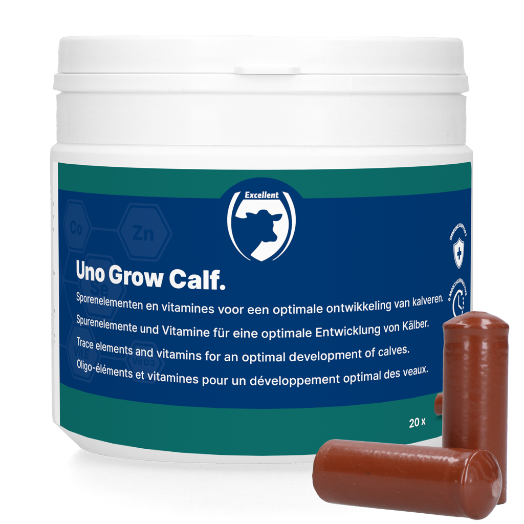 Excellent Uno Grow Calf ist ein Ergänzungsfuttermittel (Mineralfuttermittel) für eine langfristige Versorgung von grasgefütterten Kälbern mit ( wichtigen) Spurenelementen und Vitaminen für einen optimalen Start des Kalbes.