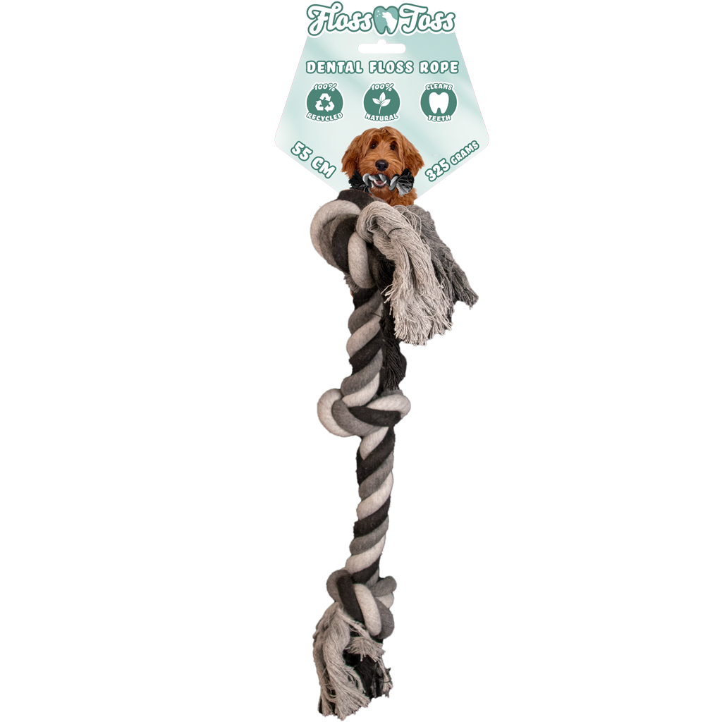 Dieses großartige Floss Dental Rope Flossseil besteht zu 100% aus natürlicher Baumwolle und ist somit sicher, langlebig und umweltfreundlich. Es ist speziell für Apportierspiele und Zerrspiele mit Hunden entwickelt. Während des Spiels hilft das Flossseil nicht nur, die Gesundheit des Mauls des Hundes zu verbessern, sondern auch, die Zähne und das Zahnfleisch zu reinigen. Dies liegt an der speziellen Flechttechnik, bei der nur ganze Fäden verwendet werden, wodurch das Flossseil enger geflochten und viel stärker als normale Flossseile ist. Darüber hinaus ist es aus recyceltem Material hergestellt und somit nicht nur gut für Ihren Hund, sondern auch für die Umwelt.