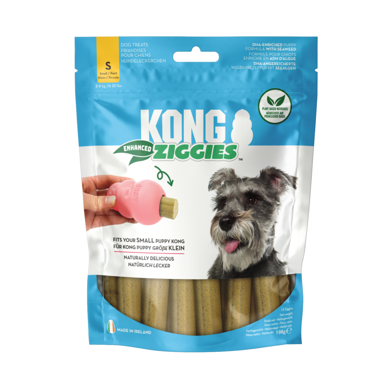 Die KONG Enhanced Ziggies Puppy sind leckere Kausticks, die die Zahngesundheit unterstützen. Die feste Textur hilft bei der Reinigung der Zähne und massiert das Zahnfleisch. Die Sticks sind mit DHA angereichert, das aus Algen gewonnen wird und die Entwicklung des Gehirns und der Sehkraft unterstützt. Die pflanzliche Rezeptur ist frei von Weizen, Mais und Soja. Ideal als Snack oder zum Füllen des KONG Puppy.