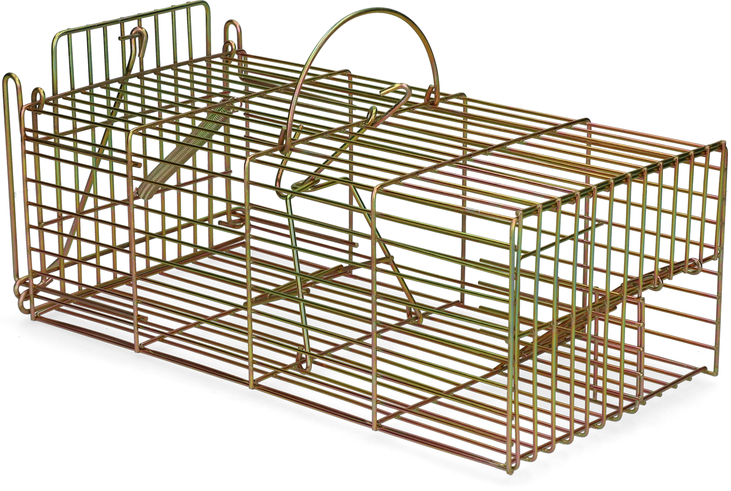 - Wenn eine Ratte durch die große Öffnung eintritt und versucht, den Köder mitzunehmen, wird der Verschlussmechansimus aktiviert und die Klappe geschlossen. Die Klappe ist mit einer zusätzlichen Barriere ausgestattet, die das Entkommen verhindert.